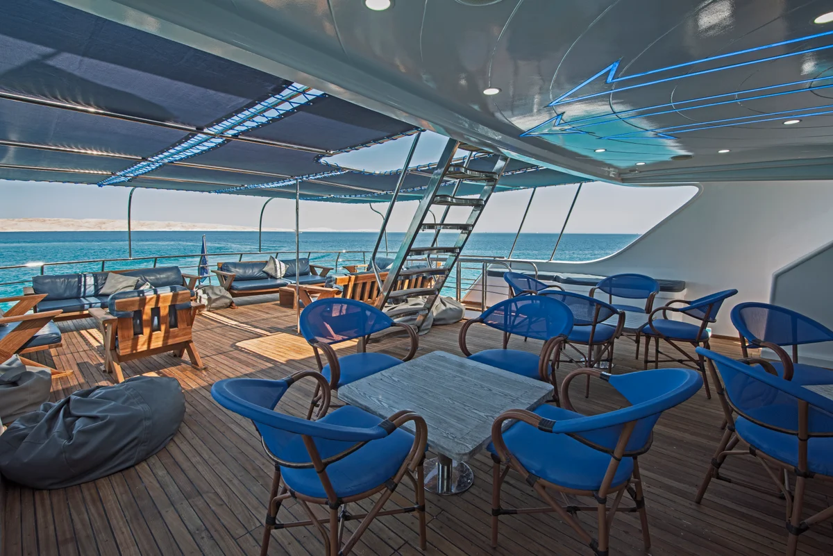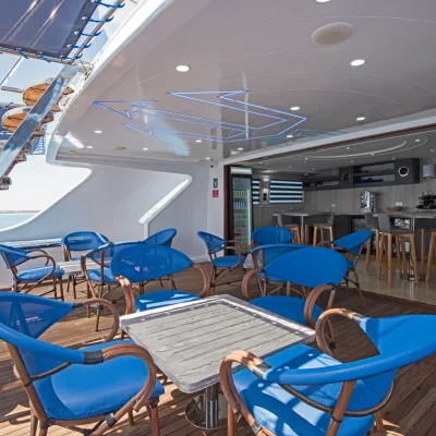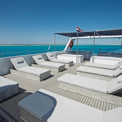 Просторный салон с кондиционером и современной системой развлечений, уютная лаунж-зона на верхней палубе с бистро и теневая зона для отдыха между погружениями создают атмосферу полного релакса. Для любителей солнца — отдельная солнечная палуба с лежаками.