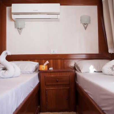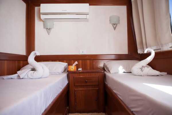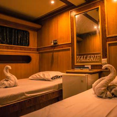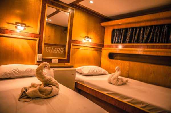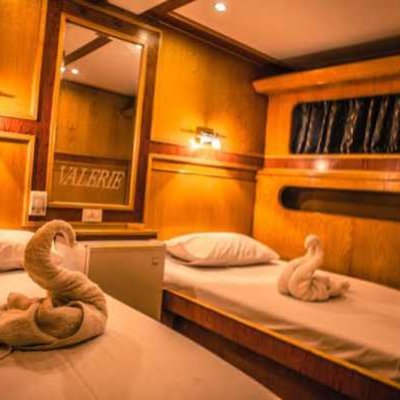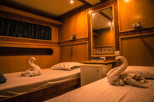 На борту сафарийной яхты Валери может размещаться до 24 человек. 8 кают на нижней палубе оборудованы двумя раздельными кроватями, 2 каюты с двуспальной кроватью – на основной палубе, 2 мастер-каюты с двумя раздельными кроватями и 1 каюта Suite с двуспальной кроватью – на верхней палубе. Все они оборудованы кондиционером и ванной комнатой с душевой.