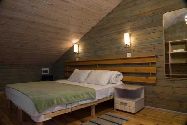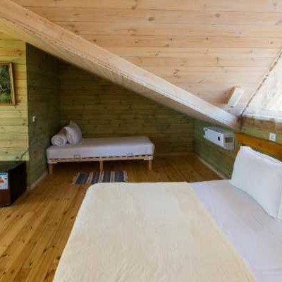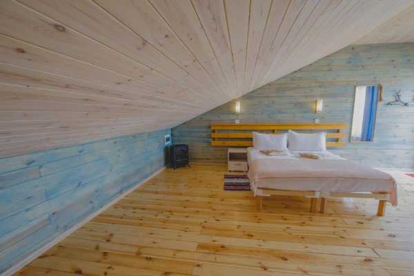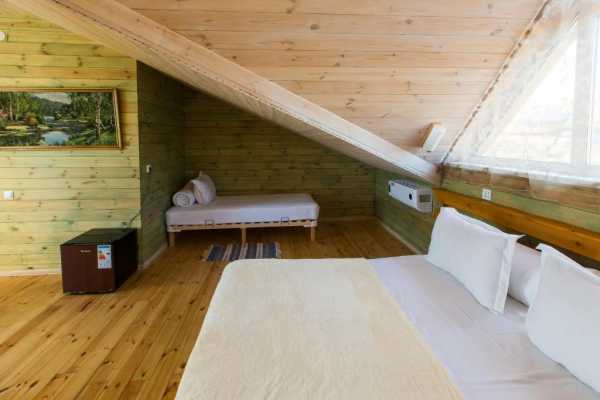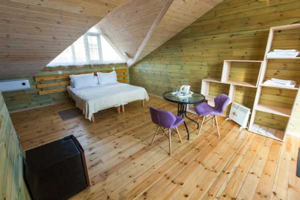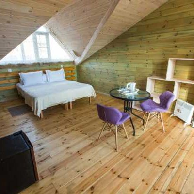 Делюкс выполнен в стиле эко-мансарда с одной двухспальной кроватью или двумя односпальными кроватями с возможностью установки полноценной дополнительной кровати при размещении 3 человек в номере. Номер укомплектован двумя креслами, журнальным столиком, шкафами для хранения одежды, холодильником и тумбочками.
