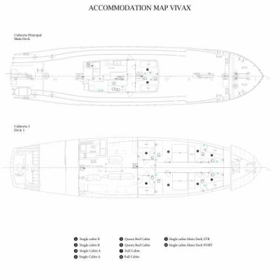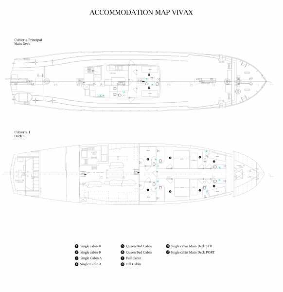 - 2 каюта Full bed (№№ 7 и 8) на нижней палубе с односпальной кроватью (100х200 см)