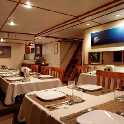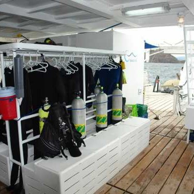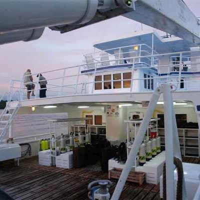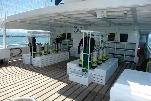 Очень комфортабельная, тщательно продуманная и разработанная для максимального удобства дайв-палуба: для каждого дайвера вы найдете здесь индивидуальные ячейки для фото/видеоаппаратуры со станцией подзарядки, ящики для хранения снаряжения, сушилки для полотенец и костюмов..
