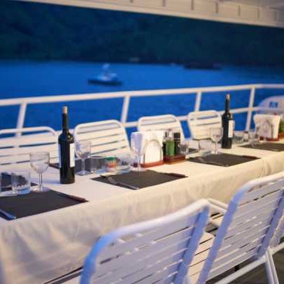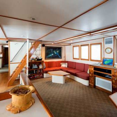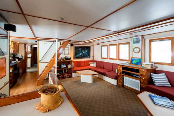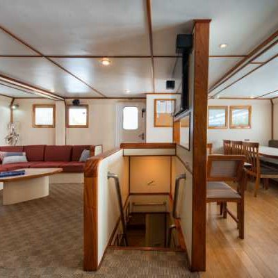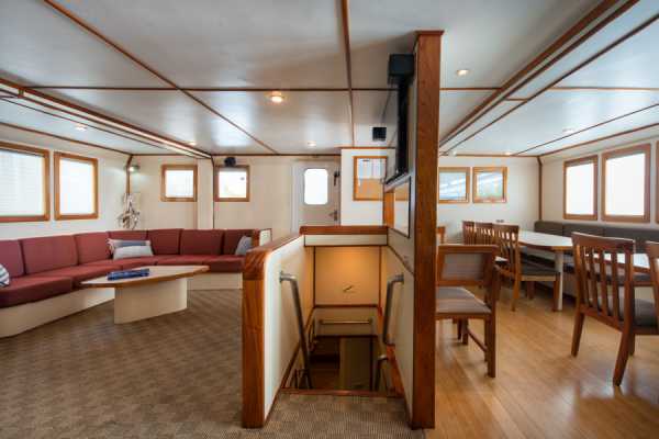 На главной палубе яхты размещается просторный, уютный салон кают-компании с теле/видео/аудиоаппаратурой и отдельный обеденный зал.