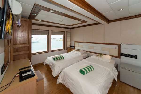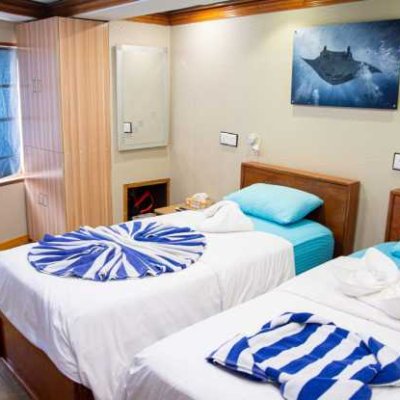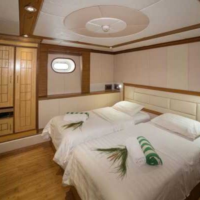 9 кают расположены на 3 палубах, каждая с двуспальной или двумя односпальными кроватями с удобными матрасами и постельным бельем, собственной ванной комнатой и индивидуальной системой кондиционирования воздуха.