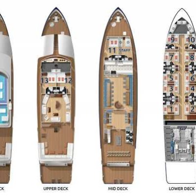 Все открытые палубы имеют тиковое покрытие.