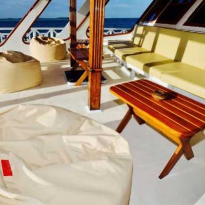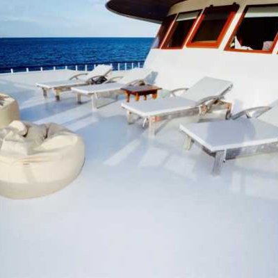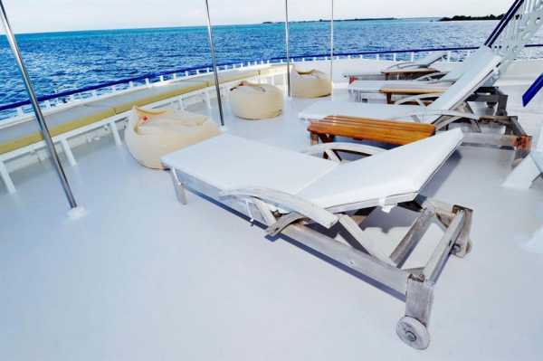 Большая солнечная палуба оснащена мягкими шезлонгами на корме лодки для отдыха между погружениями.