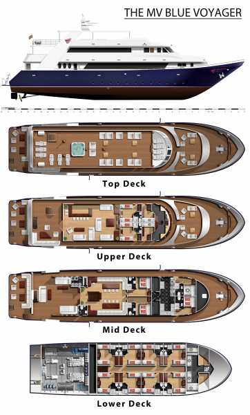 На борту MY Blue Voyager пассажиры могут отлично провести время на 2 открытых палубах для загара с удобными креслами, а также на носу корабля.