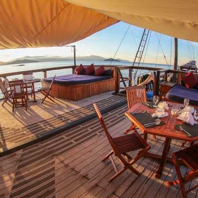 Две отдельных солнечных палубы расположены на верхнем уровне: одна из них с удобными диванами, шезлонгами, матрасами и подушками находится перед капитанской рубкой, а другая, более приватная, на корме яхты.