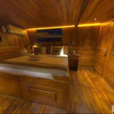 Каюта 7, самая маленькая из всех (15м2), находится на верхней палубе яхты. Двуспальная кровать раздвигается на две односпальных, в каюте также находится рабочий стол, раковина, и небольшая ванная комната с совмещенным душем и санузлом. Большие окна яхты выходят на солнечную палубу.