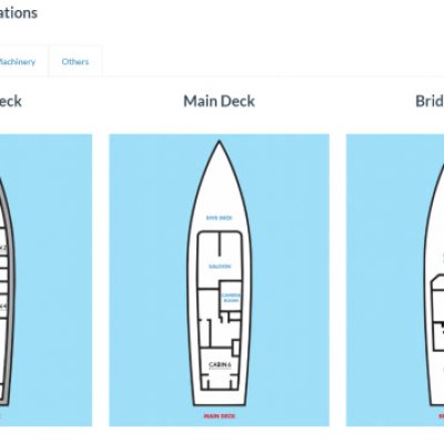 На главной палубе находится каюта Master 6, ее площадь - 35м2; большая двуспальная кровать при желании раздвигается на две полутороспальных, и здесь также имеются два рабочих стола, два шкафа, отдельно расположенные санузел и душевая. Особенность этой каюты - личная солнечная терраса с панорамными видами в кормовой части яхты.