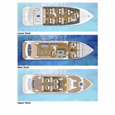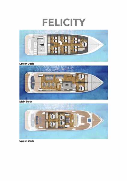 Палубы: каюты - на нижней палубе, гостиная - на главной палубе, джакузи - на верхней палубе
