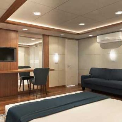 Каюты Suite, расположенные на верхней палубе, очень просторные и имеют двуспальную кровать king-size и диван-кровать. Эти каюты оснащены красивыми и большими ванными комнатами с современными удобствами, а также коммунальными услугами и удобствами.