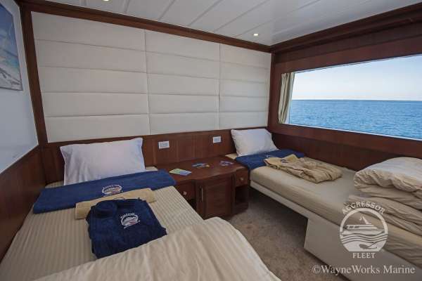 6 кают TWIN (№ 1, 2, 3, 4, 5, 6) на нижней палубе с двумя односпальными кроватями и иллюминатором, размер кают: 4,4 м х 3,8 м