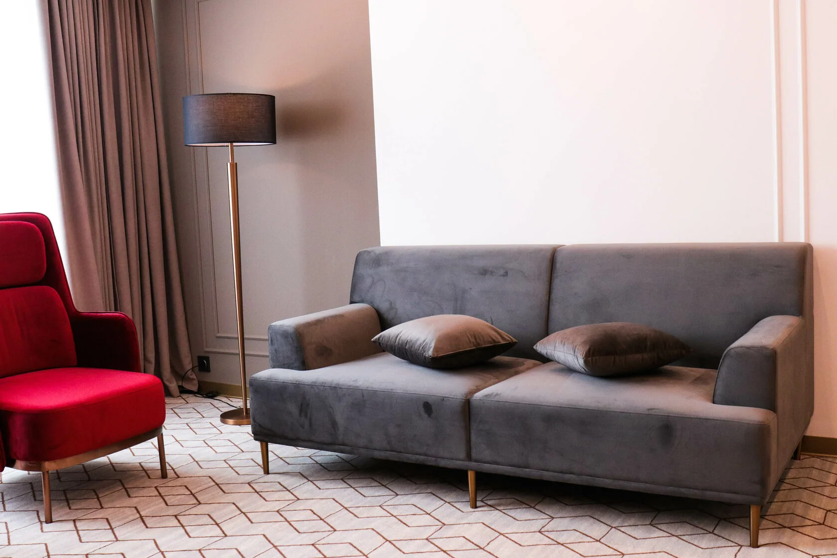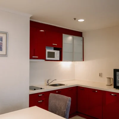 Современный двухкомнатный номер: спальня с двуспальной кроватью, гостиная с мини-кухней.