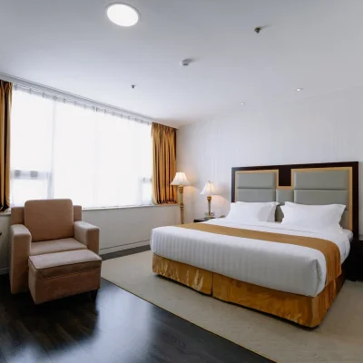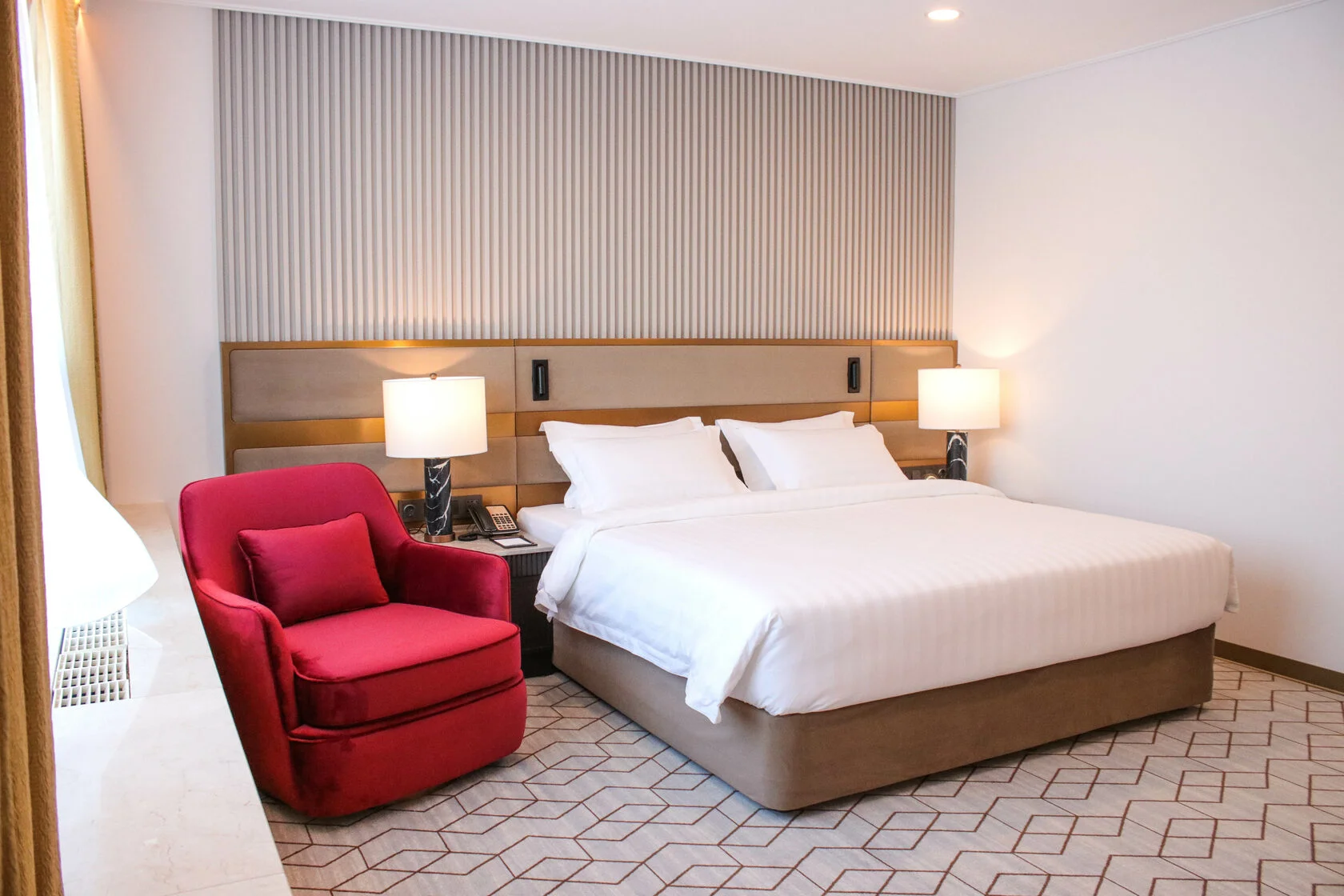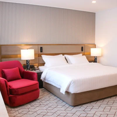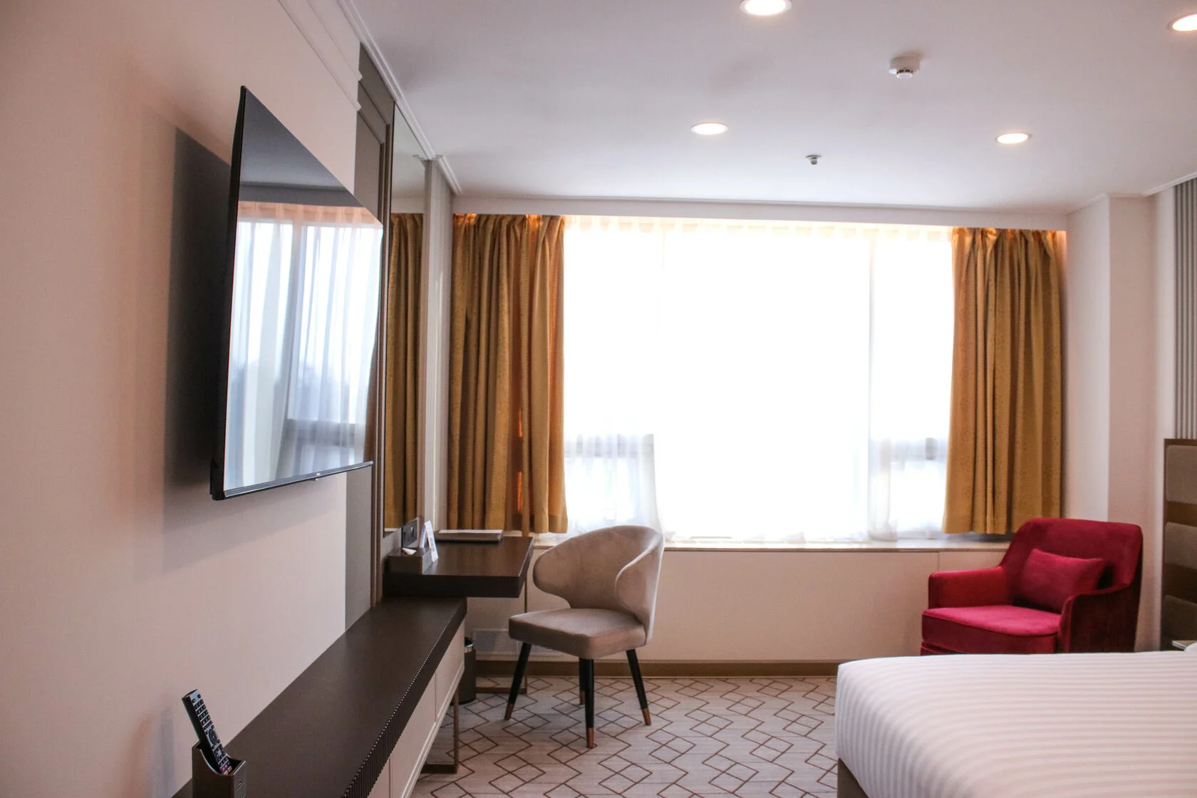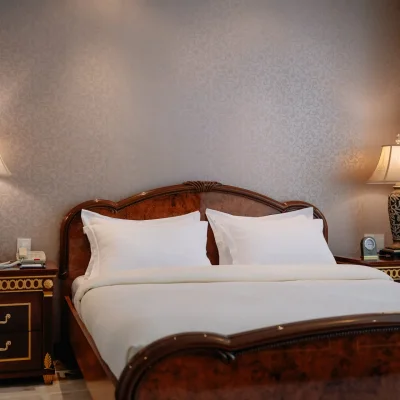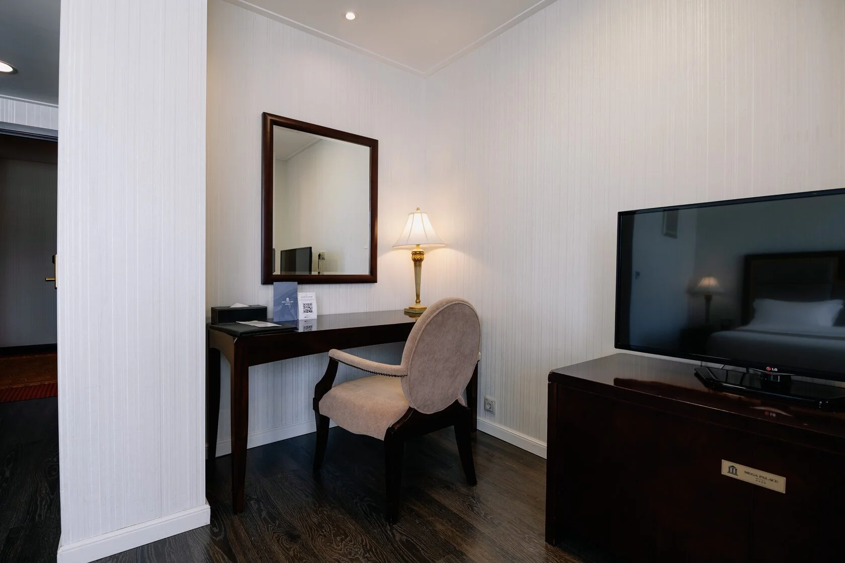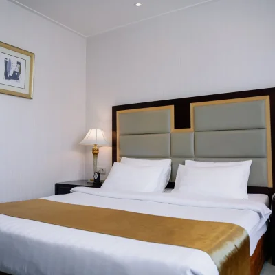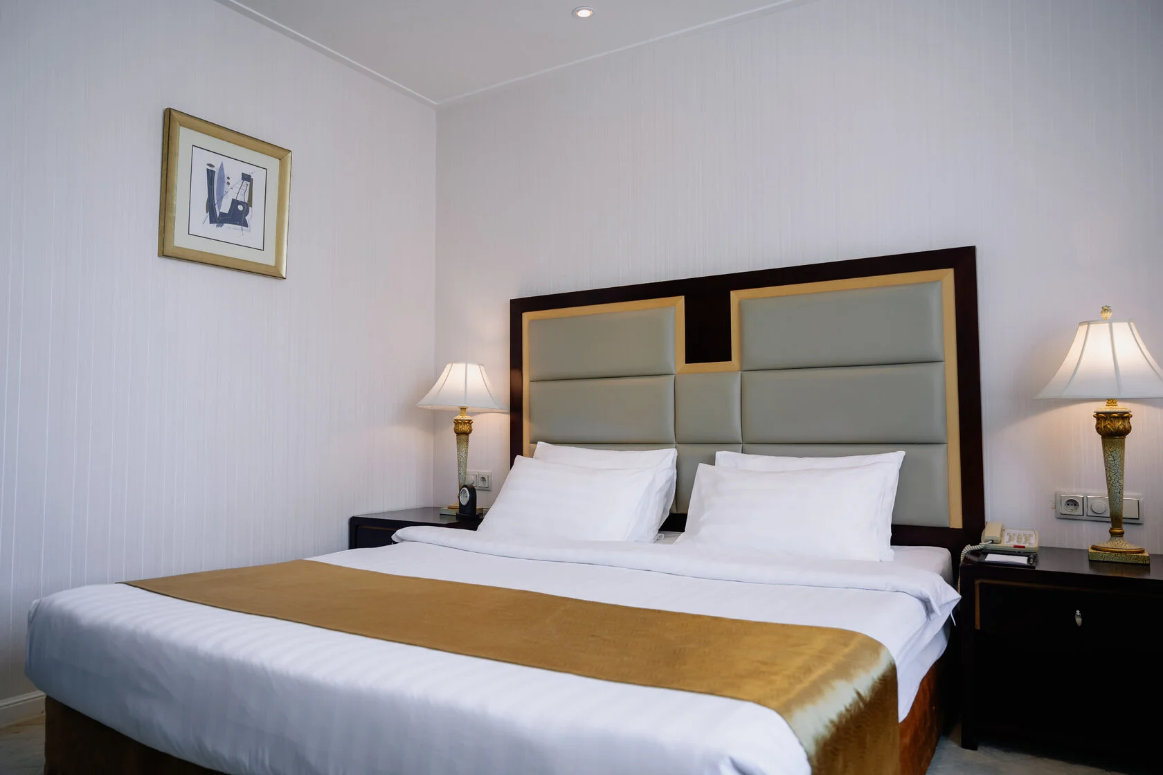 Однокомнатный номер с большой кроватью King Size, ванной комнатой с совмещенным санузлом, пл.: 26 кв.м; в номере: Телевизор, Холодильник, Мини-бар, Чайник, Рабочий стол, Телефон, Сейф, Комплект офисных принадлежностей.