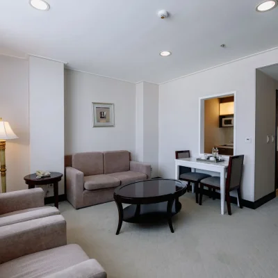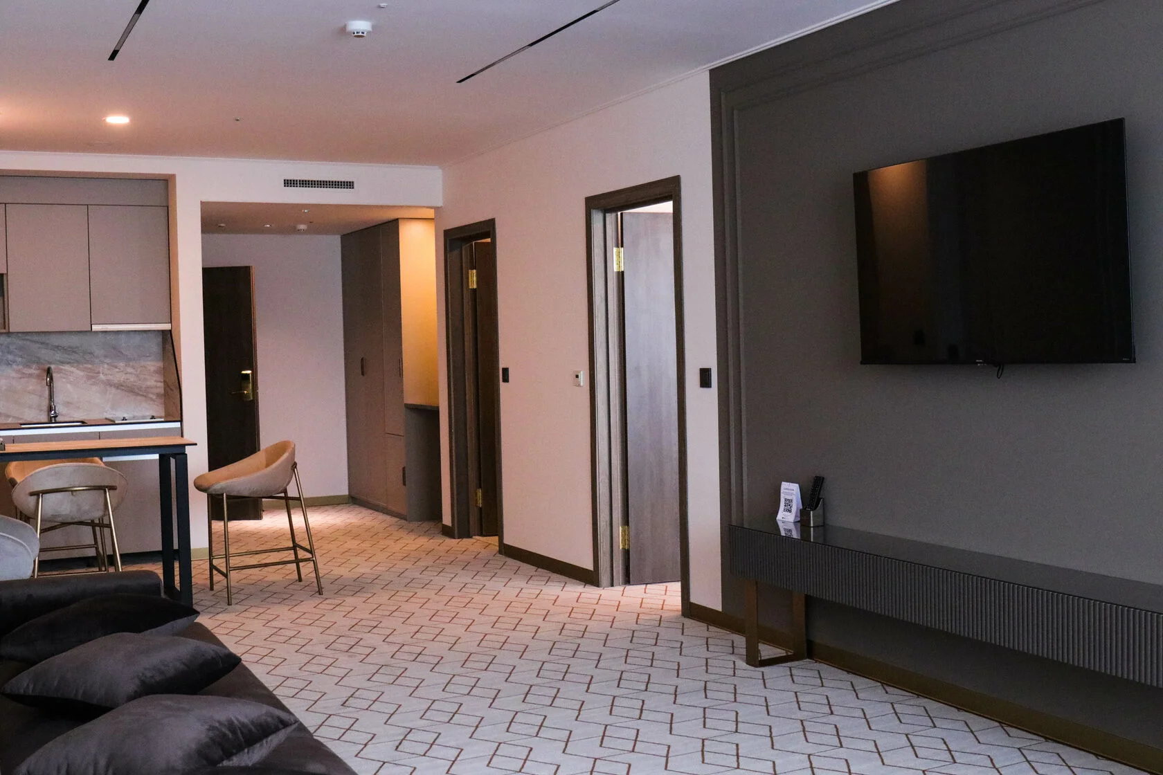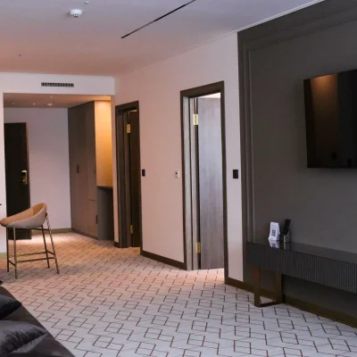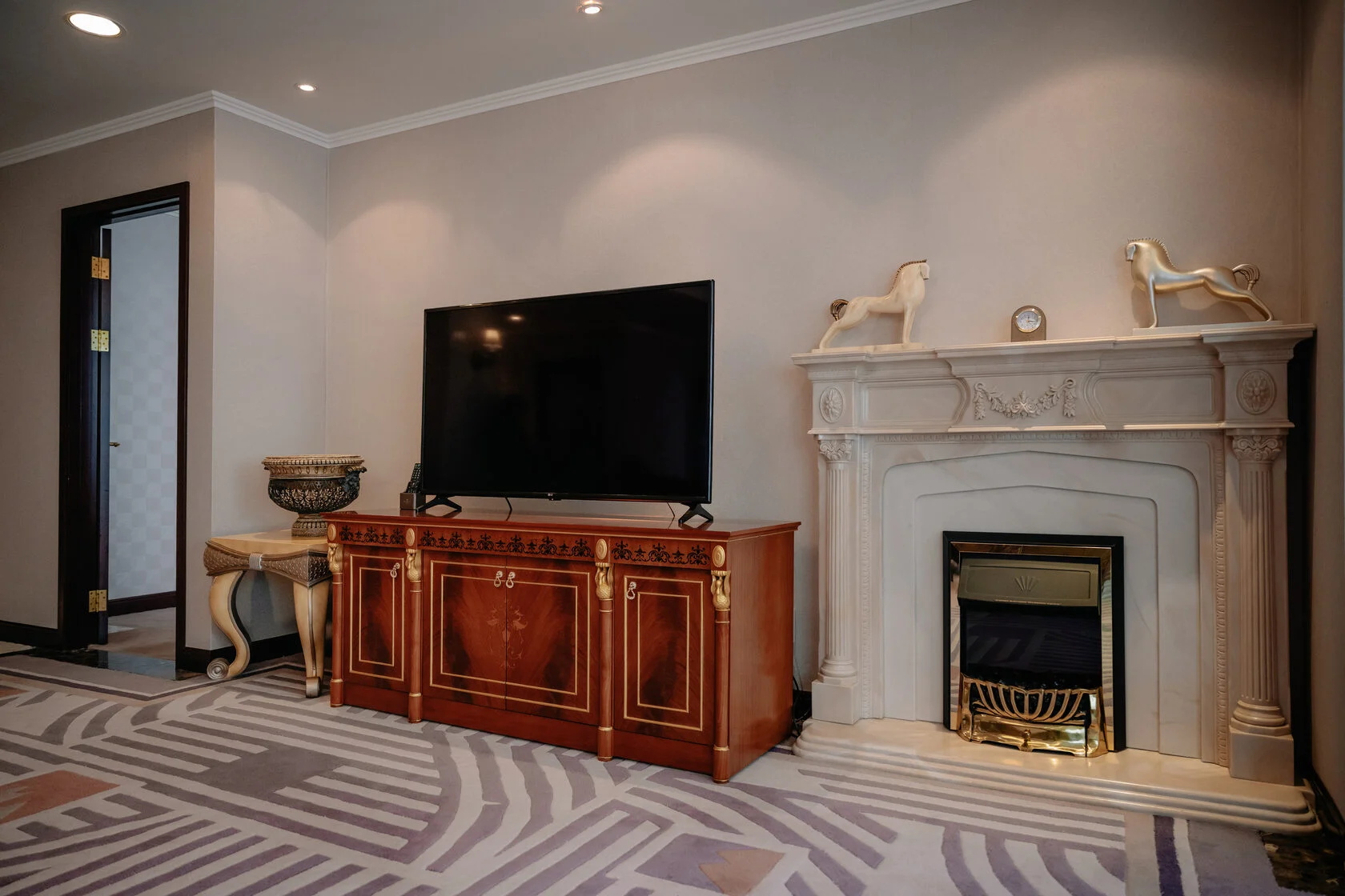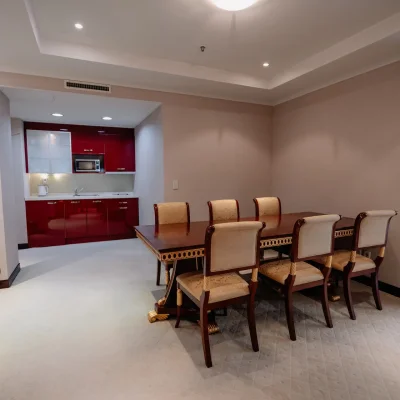 Просторная гостиная, кухня, две спальни и большая ванная комната делают этот номер удобным для проживания VIP-гостей с друзьями или целой семьей. Два рабочих места и три кровати позволяют сделать из апартаментов настоящий дом для нескольких семей, где можно и работать, и отдыхать. А в конце дня собираться всем вместе перед телевизором в гостиной на большом диване и мягких креслах.
