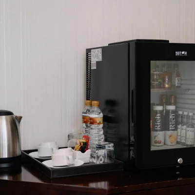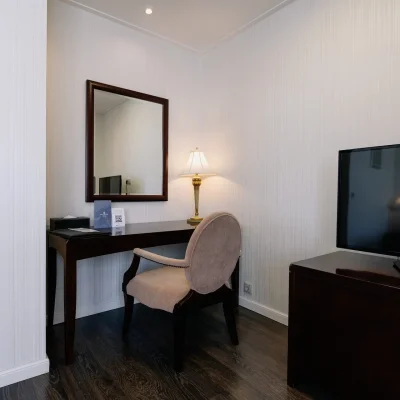 в номере: Телевизор, Холодильник, Мини-бар, Чайник, Рабочий стол, Телефон, Сейф, Комплект офисных принадлежностей.