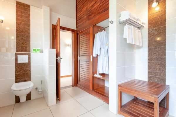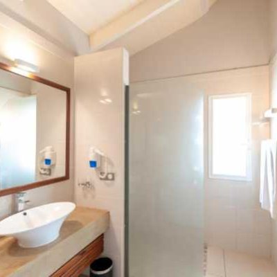 Собственная ванная комната с душем укомплектована феном.
