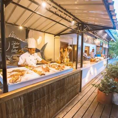 Благоухающие вечера под звездами. Ужин на открытом воздухе с фантастическим видом на море и пляж, предлагающий настоящий "вкус гриля", с настоящим опытом "живого приготовления", чтобы создать новое измерение в кухне фьюжн, с фирменными блюдами на гриле, тандури и дровяной печи для пиццы.