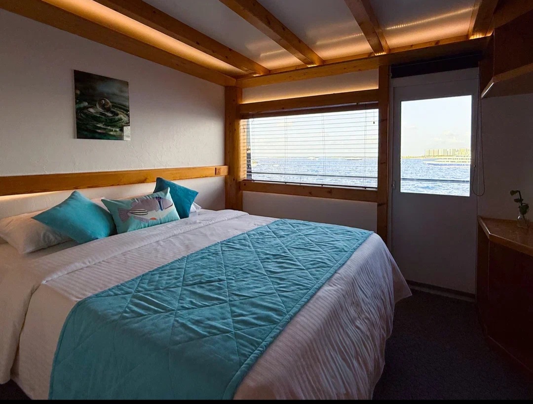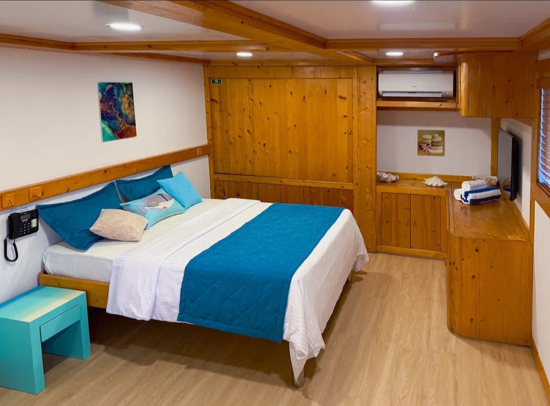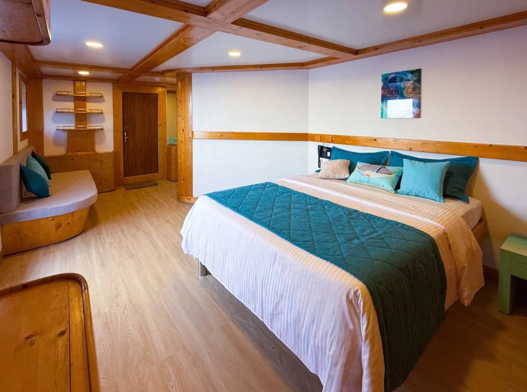 Deluxe Queen bed (connected) №15 и №16 - двухместные каюты, имеют 2-спальную кровать queen size площадью 9 м² и могут соединяться общей дверью с номерами Deluxe twin (№13 и №14), что идеально подходит для отдыха с детьми.