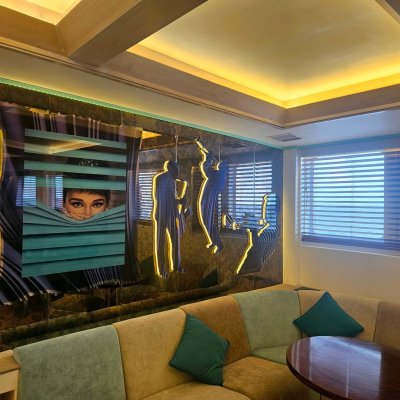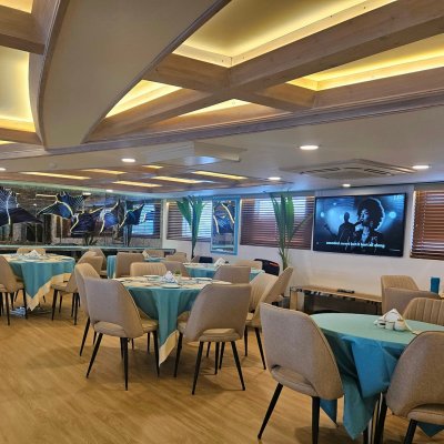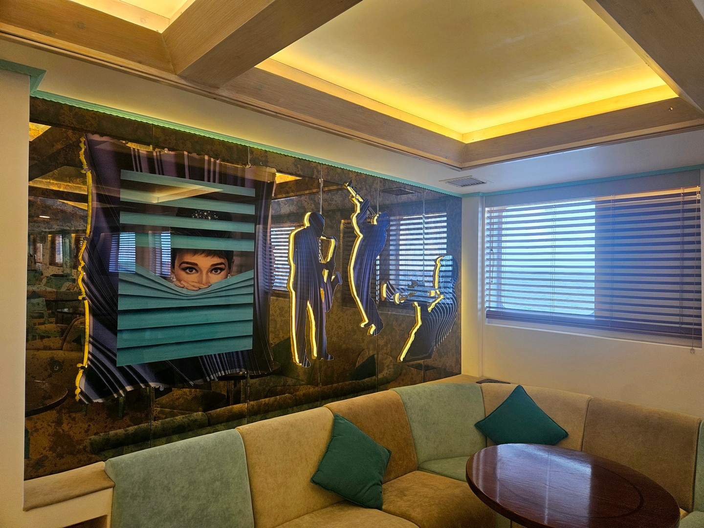 Интерьер: 4 палубы, 1 ресторан, 2 бара, 1 небольшой бассейн