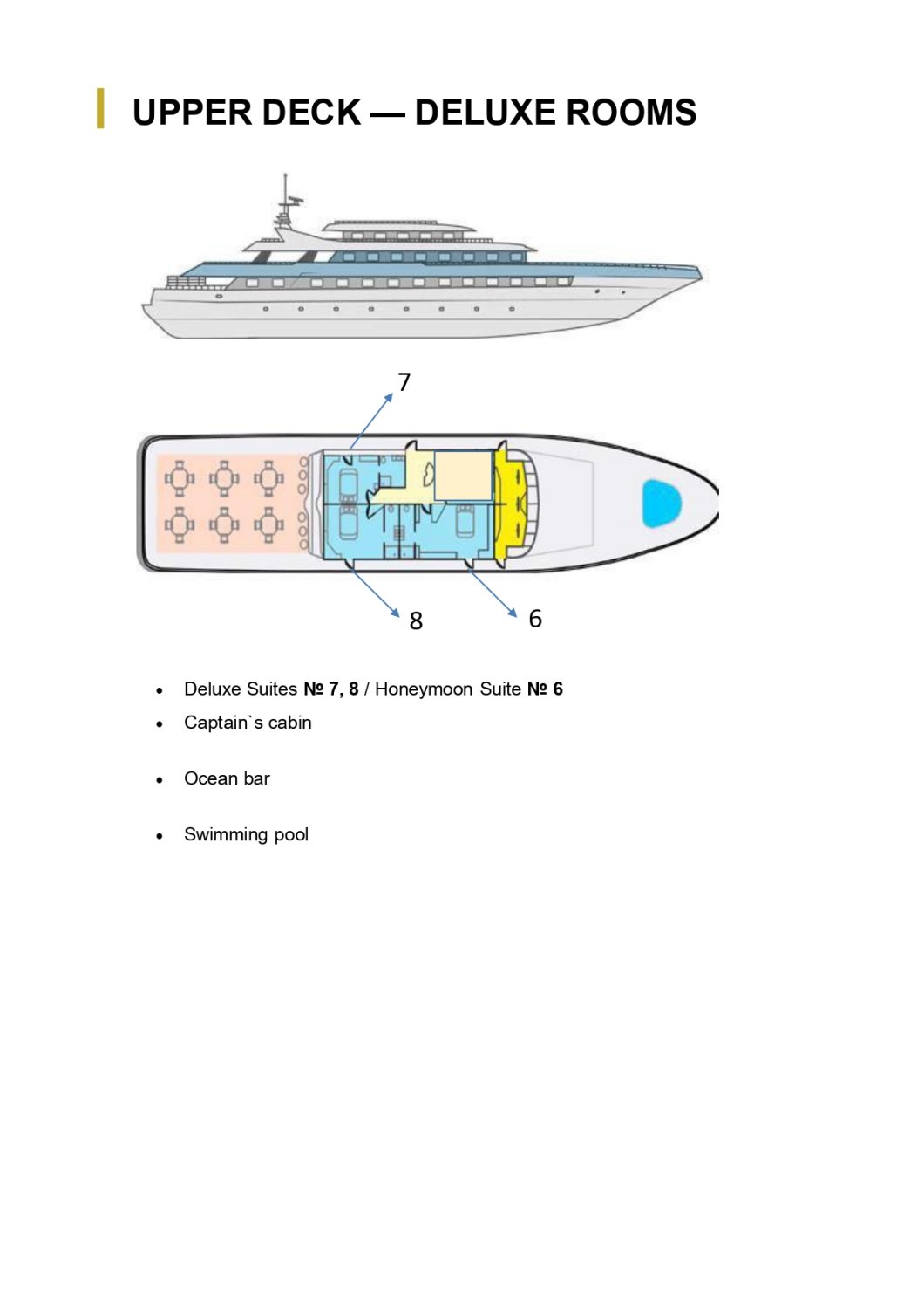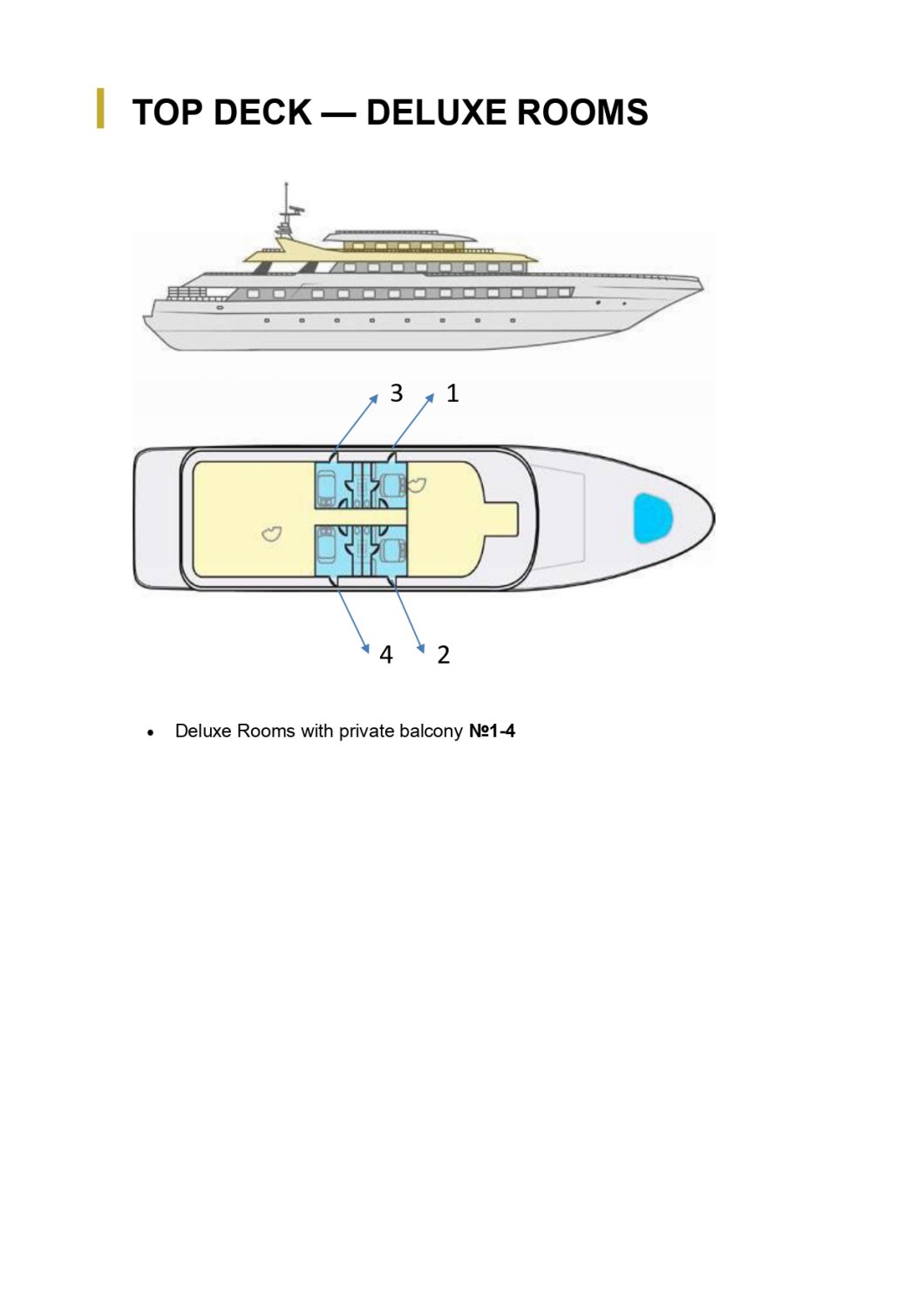 На верхней палубе расположены 4 каюты Deluxe Ocean view (№№ 1-4) площадью от 10 до 13 кв. м, каждый с кроватью размера queen-size.