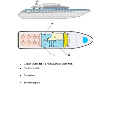 Три сьюта на верхней палубе — самые просторные каюты на яхте, номера кают 6-8.