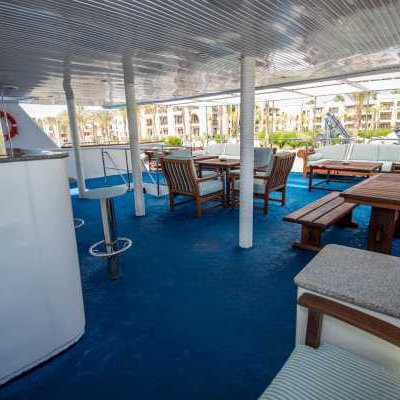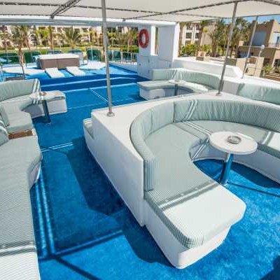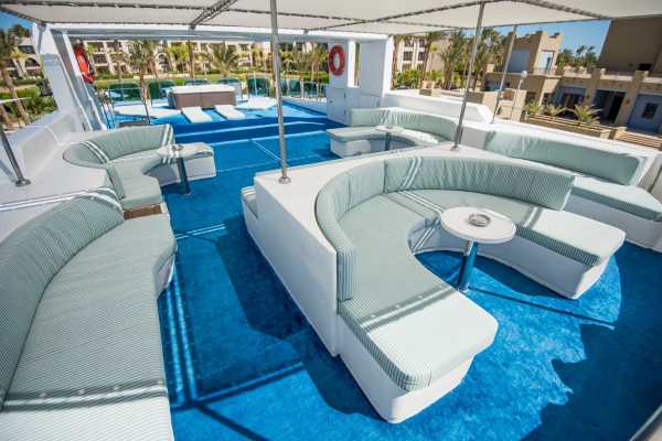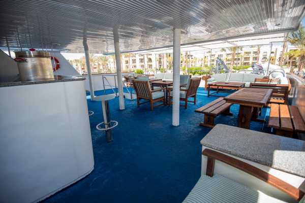 – полузатененный сан-дек: бар, диваны и столики для напитков, шезлонги, джакузи