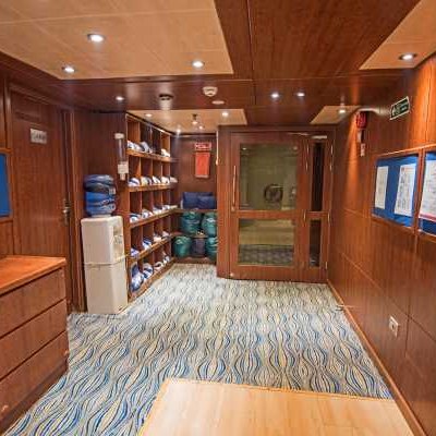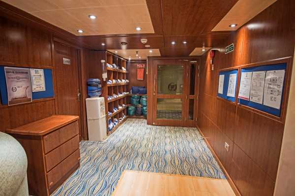 Безопасность: автоматическая система пожаротушения во всех помещениях, система аварийного оповещения, огнетушители. Индивидуальные спасательные жилеты, 2 спасательных плота на 25 человек каждый, сигнальные ракеты и дымовые сигналы. Баллоны с кислородом, аптечка первой помощи.
