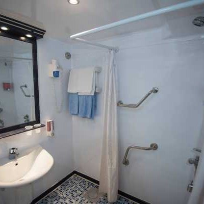В каждой каюте: санузел с душем, сейф, письменный стол, шкаф для одежды, холодильник-минибар, регулируемый кондиционер, оборудование для приготовления кофе и чая, телевизор, видео-плейер, радио, фен.