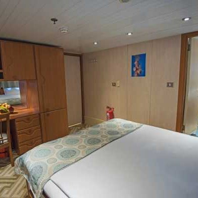 – 4 двухместные каюты на главной палубе: 2 каюты с двумя раздельными кроватями на одном уровне, 2 каюты с двуспальными кроватями + диван и кофейный столик в каждой каюте (общая площадь каждой каюты, включая санузлы — 16 кв.м)