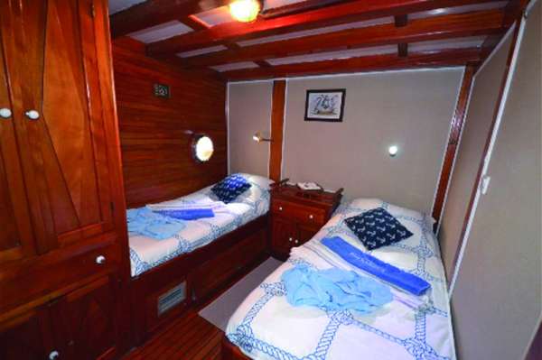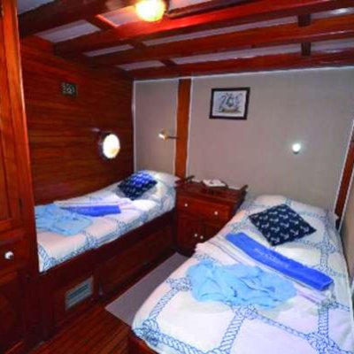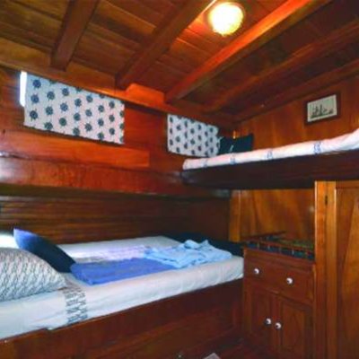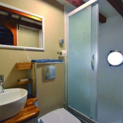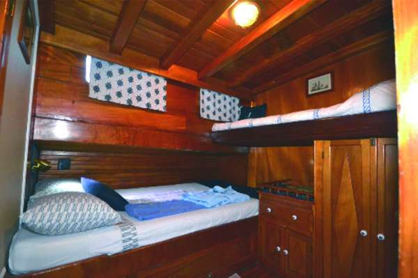 РазмещениеВсего 8 кают (7 для гостей); среди них 3 с двуспальной кроватью, 2 с односпальными кроватями и 2 с двуспальной кроватью и односпальной кроватью наверху. Все каюты имеют собственный кондиционер и ванные комнаты с душем. Банные полотенца, халаты и пляжные полотенца также предоставляются.