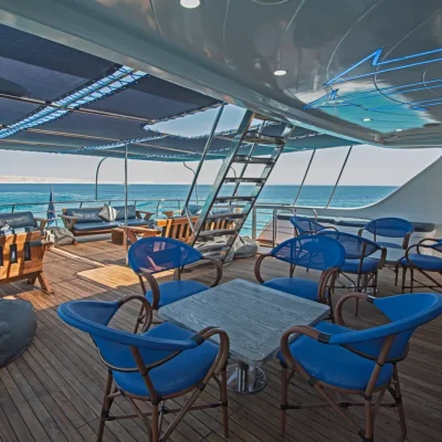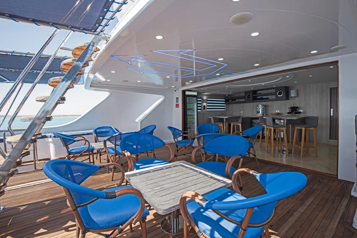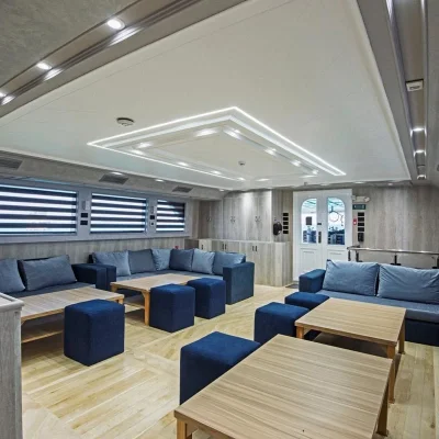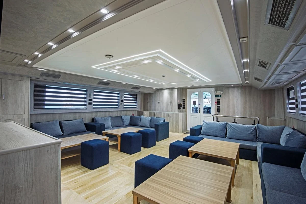 Просторный салон с кондиционером и современной системой развлечений, уютная лаунж-зона на верхней палубе с бистро и теневая зона для отдыха между погружениями создают атмосферу полного релакса. Для любителей солнца — отдельная солнечная палуба с лежаками.