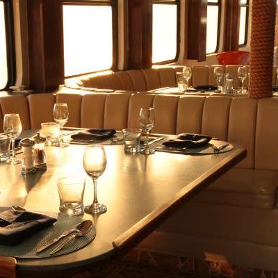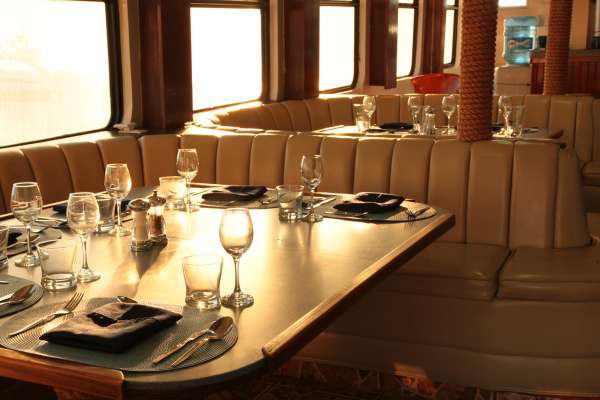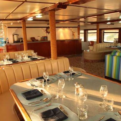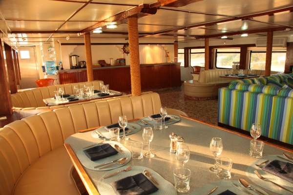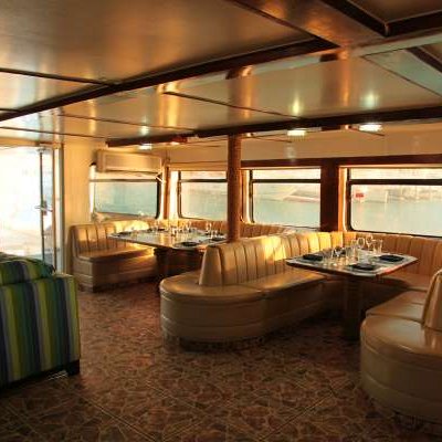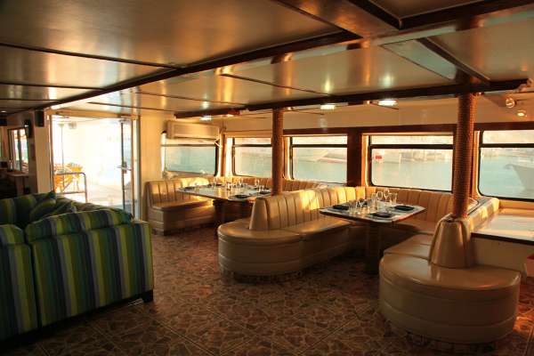 Салон-ресторан находится на главной палубе, полностью кондиционирован, оборудован удобными диванами и креслами.