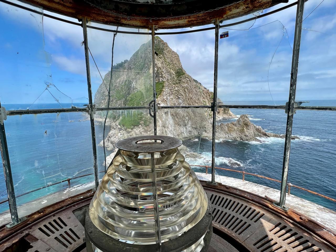 Отправляемся к маяку Анива. Вода искрится под солнцем, а ветер наполняет паруса. Маяк величественно возвышается над скалами. Мы наслаждаемся его красотой и слушаем захватывающие истории гида.